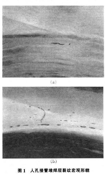某化工有限公司在生產(chǎn)混合甲苯產(chǎn)品的裝置中.對(duì)1臺(tái)2006年投入使用的二段加氫不銹鋼反應(yīng)釜首次進(jìn)行全面檢驗(yàn),在人孔接管堆焊層經(jīng)滲透檢測(cè)發(fā)現(xiàn)有多條環(huán)向裂紋。裂紋宏觀形貌如圖1所示。