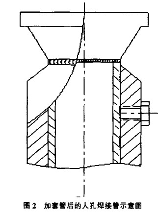 (3)介質(zhì)對(duì)容器壁的影響氫氣和微量的硫化氫在此工作壓力和工作溫度時(shí)不會(huì)對(duì)復(fù)合層OCr18Ni10Ti和基層材質(zhì)15CrMOR產(chǎn)生氫腐蝕。綜上分析可知,該裂紋是因堆焊而產(chǎn)生的。堆焊層間溫度控制不穩(wěn)定.合金元素的流失產(chǎn)生硬脆的馬氏體組織,焊后熱處理溫度不均勻是裂紋生成的主要因素。加氫不銹鋼反應(yīng)釜消除缺陷的工作是重中之重,制造廠提出回廠全面返修,徹底消除隱患。用戶認(rèn)為不能耽誤生產(chǎn)工期,由于裂紋產(chǎn)生的原因和裂紋并未對(duì)基材造成破壞。采取了在人孔焊接管內(nèi)加0Cr18Ni10Ti的4mm套管,如圖2所示。